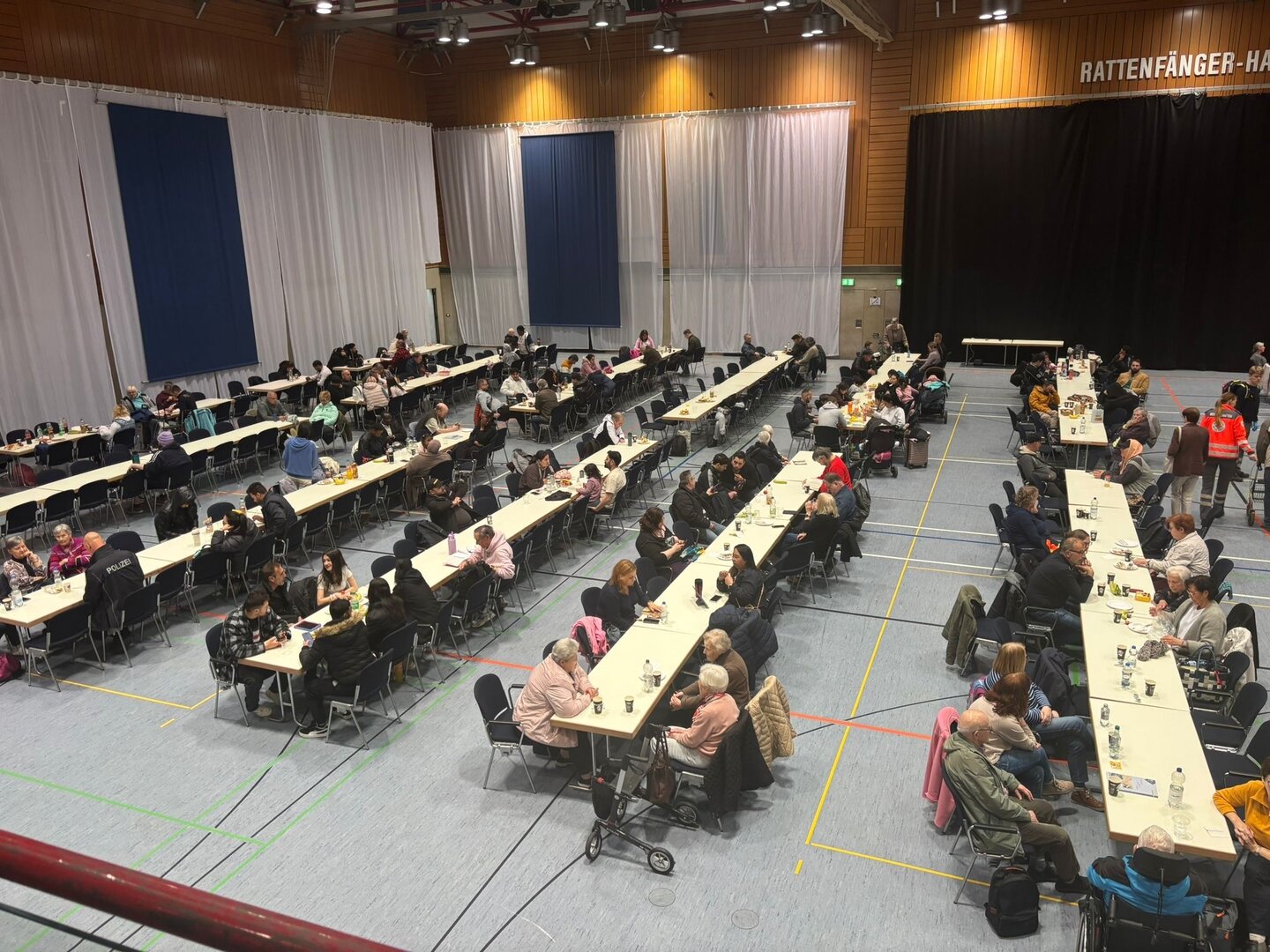 Am Sonntag um 03:30 Uhr rückten insgesamt 31 ehrenamtliche Einsatzkräfte mit acht Einsatzfahrzeugen aus, um zwei Notunterkünfte in Betrieb zu nehmen. Diese befanden sich in der Rattenfängerhalle sowie in einer nahegelegenen Schule in Hameln.